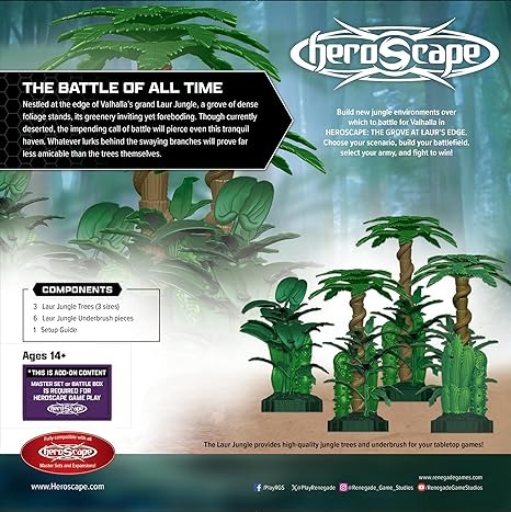 Nestled at the edge of Valhallas grand Laur Jungle, a grove of dense foliage stands, its greenery inviting yet foreboding. Though currently deserted, the impending call of battle will pierce even this tranquil haven. Whatever lurks behind the swaying branches will prove far less amicable than the trees themselves. Build new jungle environments over which to battle for Valhalla in HEROSCAPE: THE GROVE AT LAURS EDGE. Choose your scenario, build your battlefield, select your army, and fight to win! This terrain set includes 3 Laur Jungle trees, 6 Laur Jungle Underbrush pieces, and a setup guide to maximize your use of these striking new terrain features. This set is fully compatible with all Heroscape Master Sets and Expansions! Requires core game to play. Features: New Laur Jungle Trees and underbrush! Unique locking hex-tile terrain system! Introduces the Heroscape Terrain System product line! Compatible with previous and upcoming Heroscape releases!